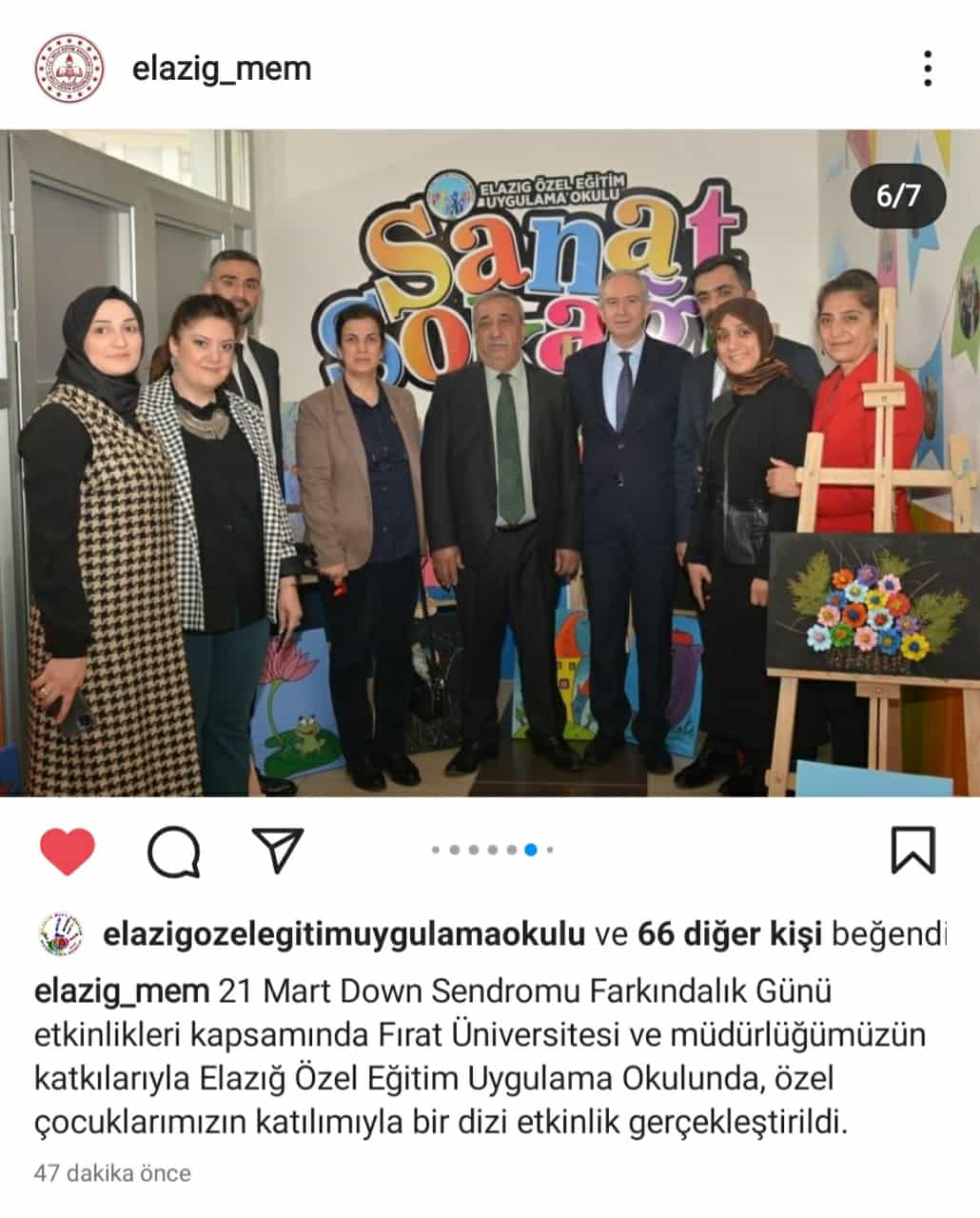 21 Mart Down Sendromu Farkındalık günü sebebi ile Fırat Üniversitesi ve İl Milli Eğitim Müdürlüğü, Elazığ Özel Eğitim Uygulama Okulunda Bir dizi etkinlikler gerçekleştirildi. Etkiinikte Resim iş öğretmenliği öğrencilerinin Dr. Ogrt. Üyesi Yelda Usal önderliğinde yaptıkları Sanat Sokağı'nın açılışını; Rektör Yardımcısı Prof.Dr Bilal Üstündağ ve Engelliler Araştırma ve Uygulama Merkezi Müdürü Prof.Dr Hatice Eröksüz, İl Milli Eğitim'den şube müdürleri ve Elazığ Özel Eğitim Uygulama Okulu Müdürü Caner Kaya ve Eğitim Fakültesi öğretim üyeleri yaptı. Açılış sonrasında Resim-iş, Sınıf, Okul öncesi öğretmenliği öğrencileri Özel Eğitim ogrencileri ile etkinlikler gerçekleştirdiler.